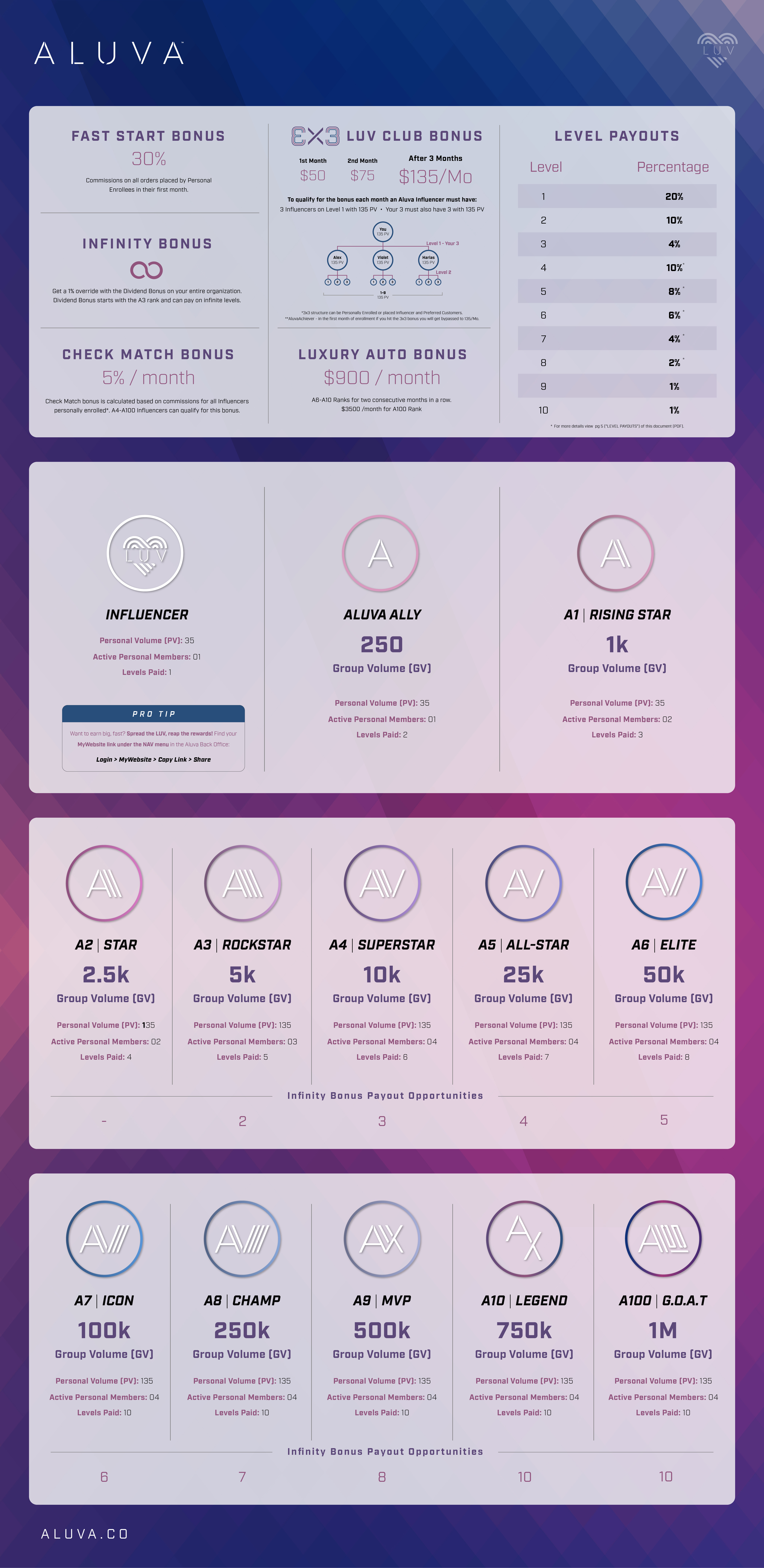 Commission Eligibility - ALUVA pays commissions daily based on the prior month rank qualification.